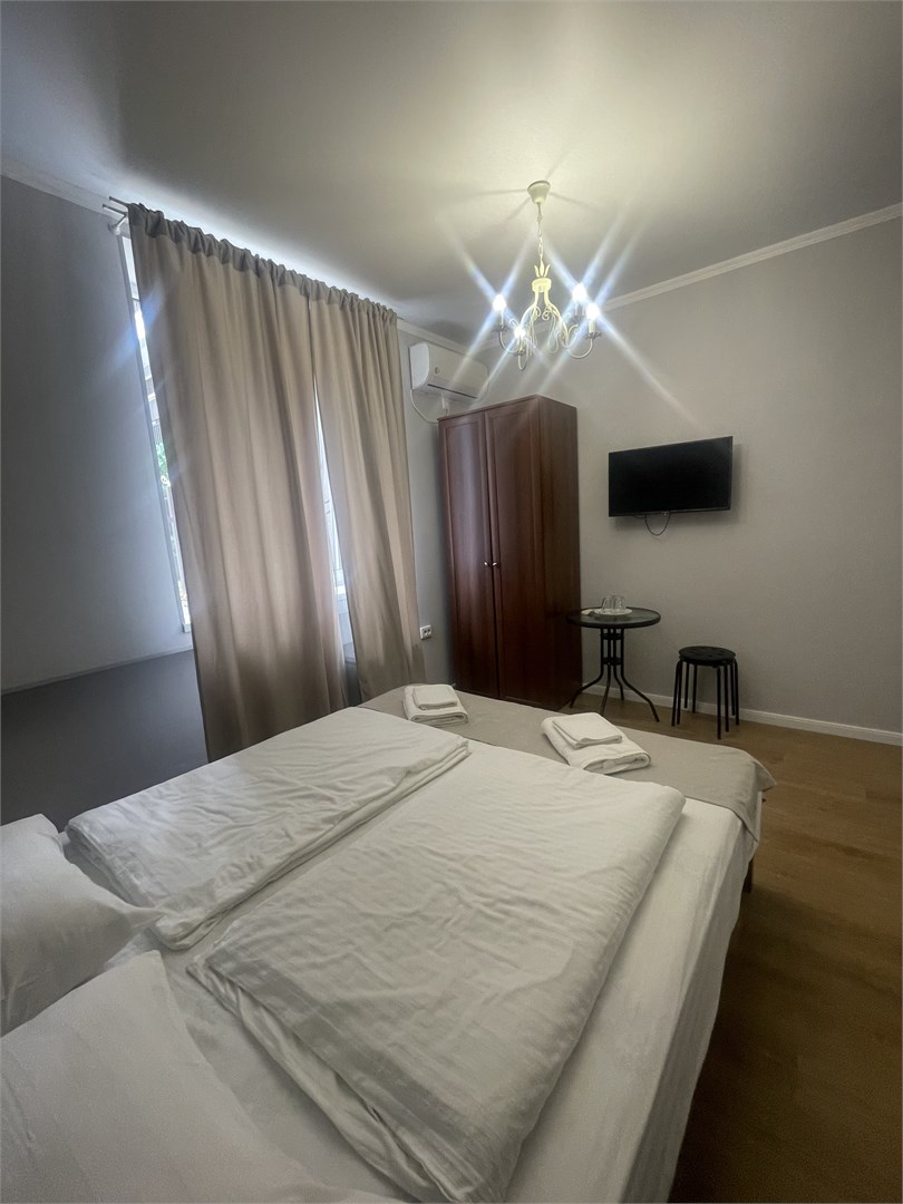 Площадь номера - 14 кв.м. 1 комната. 2 осн. места. В номере: телевизор; холодильник; кондиционер; душ; туалет; сейф; 2-спальная кровать; чайник.