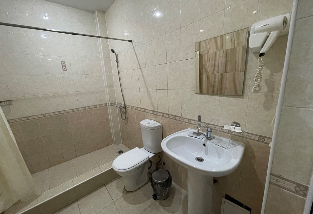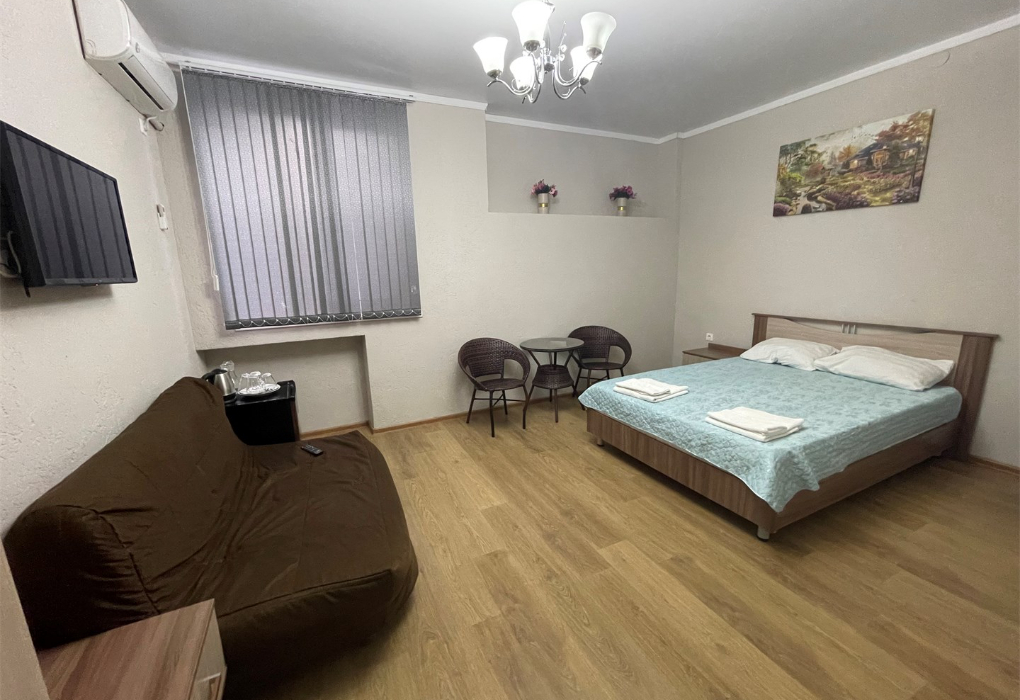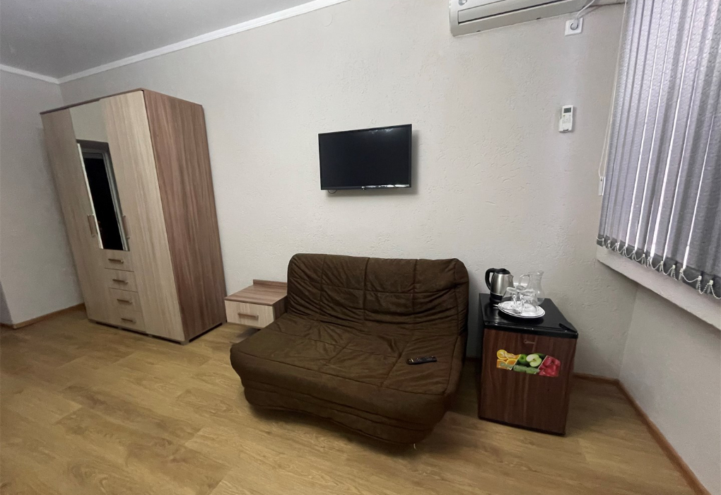 Площадь номера - 25 кв.м. 1 комната. 4 осн. места. спальные места: 2-спальная кровать + диван-кровать. В номере: телевизор; холодильник; кондиционер; душ; туалет; фен; сейф; чайник. 1 доп. место: